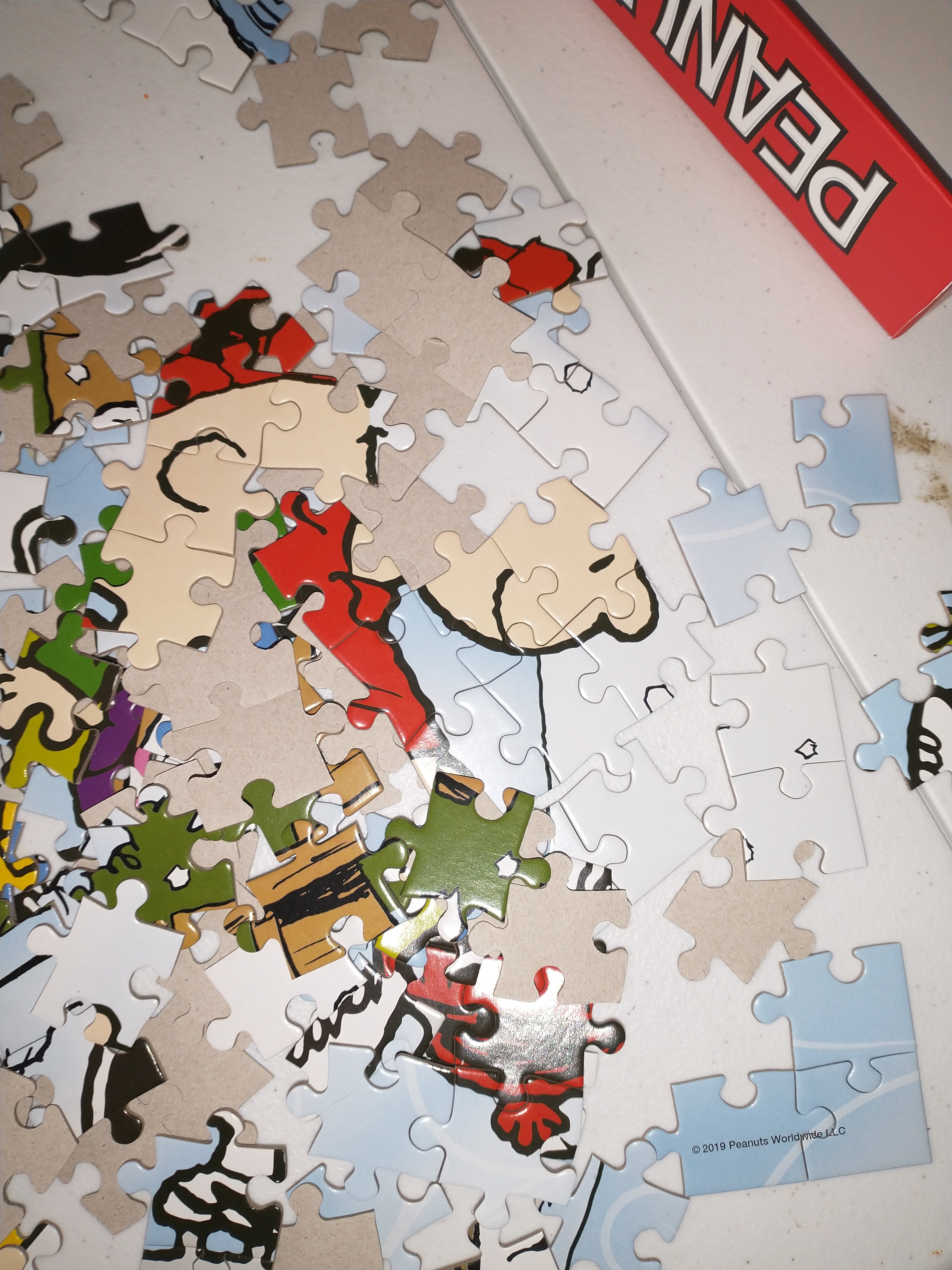 With my PTSD, I really struggle to focus on things. As such, I was feeling really proud of the progress that I made on a puzzle that I got earlier this year. It's not crazy elaborate and it's not thousands of pieces. It's a Charlie Brown winter scene.